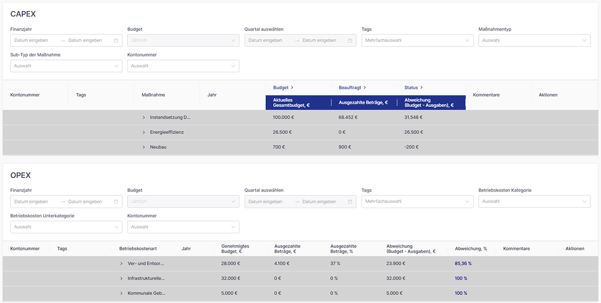 At building level, you plan your specific measures such as repairs and refurbishments and your operating costs. By recording the actual costs, you can monitor the deviation from the budgets and the contracted amount and react promptly if budgets are exceeded or remain unused.