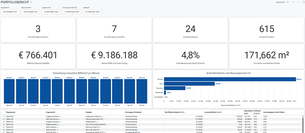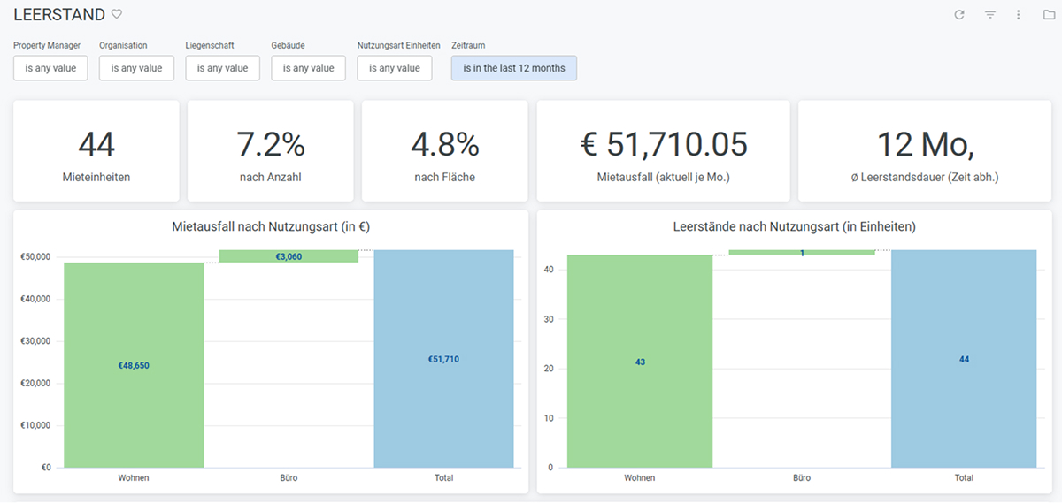 A wide range of reports and dashboards are available, covering all aspects from asset and esg management via portfolio and rental income to vacancy reports.